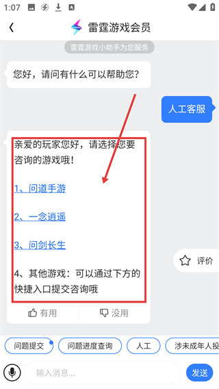 4、联系人工客服后,会收到游戏选择列表,挑选对应的游戏,即可针对该游戏咨询相关问题哦。