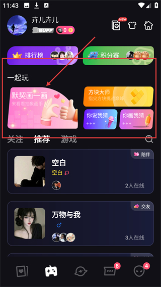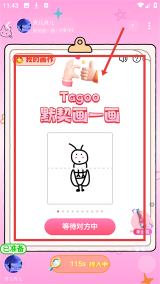 2、进入游戏页后,选【默契画一画】选项,能进入该游戏的匹配页面,等待其他玩家匹配啦。