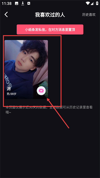 3、在“我喜欢过的人”页面选中心仪用户,点击就能进入其详情页,方便后续互动操作哦。