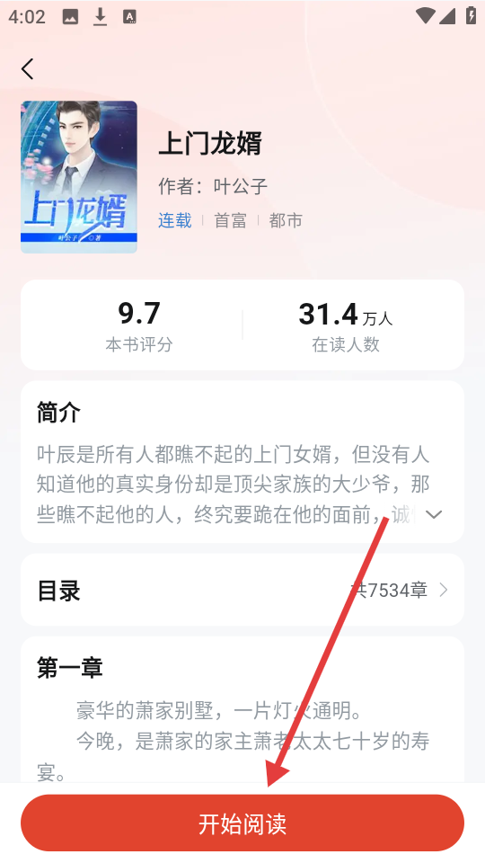 3、看到感兴趣的小说,像【上门龙婿】,点击进入详情页后,再点击【开始阅读】按钮,就能开启阅读之旅啦。