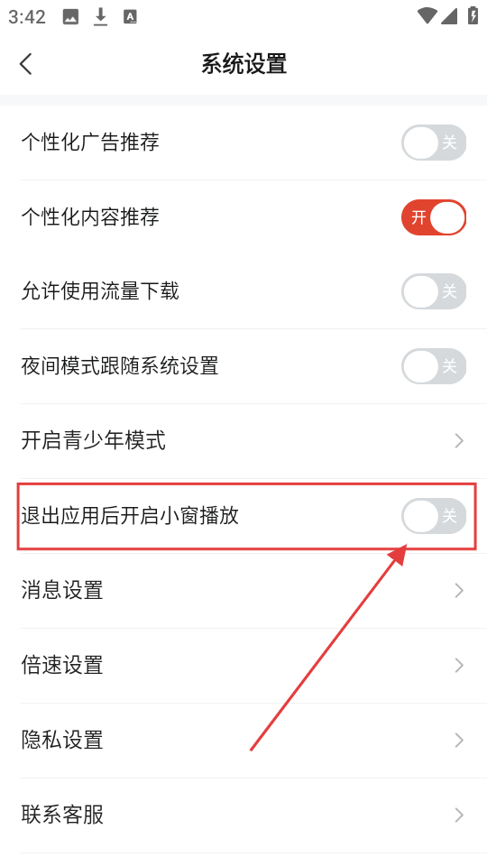 3、进入设置页面后,找到【退出应用后开启小窗播放】选项,此时它处于关闭状态,准备开启该功能哦。