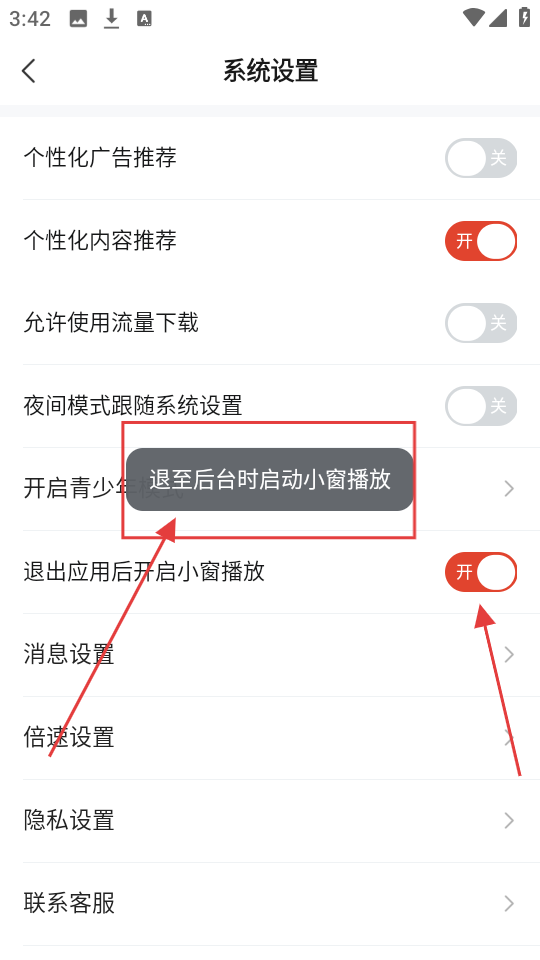 4、点击【退出应用后开启小窗播放】对应的开关,将其打开,这样退出应用后就会启动小窗播放啦。