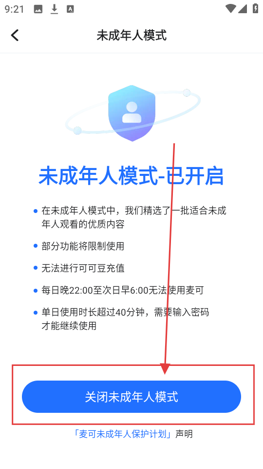 3、在未成年人模式页面,点击【关闭未成年人模式】,可进入密码输入页面,准备关闭该模式啦。