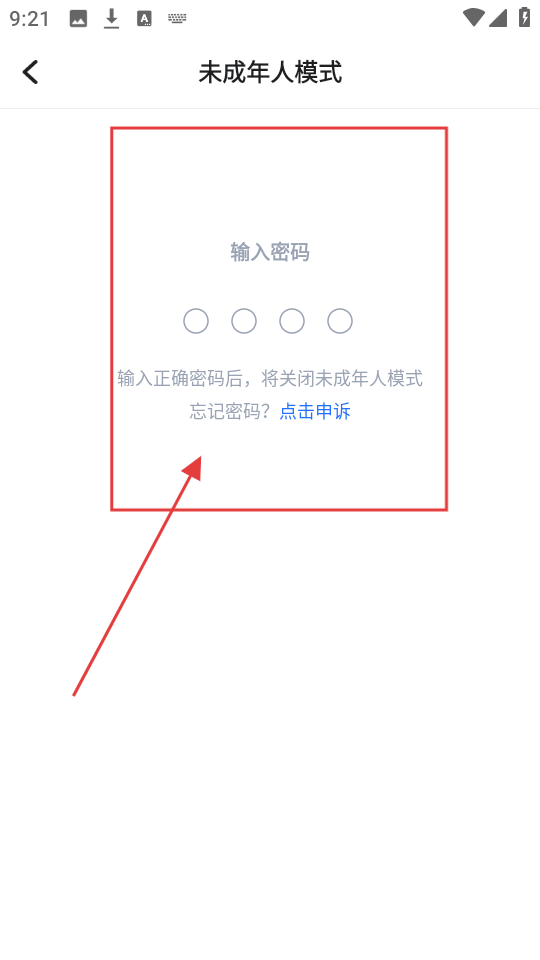 4、在密码输入页面,输入正确密码,即可关闭未成年人模式,恢复软件正常使用哦。
