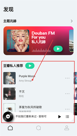 1、在豆瓣FM的发现页,能看到私人推荐的歌曲列表,选喜欢的歌曲点进去,就能进入播放页面听啦。