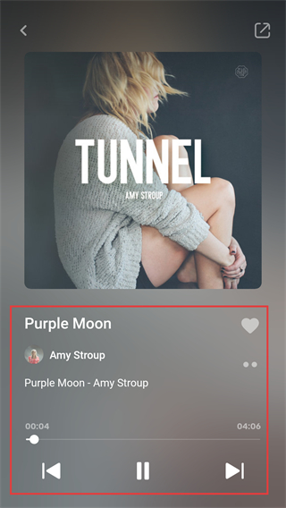 2、进入歌曲播放页后,可看到歌曲【Purple-Moon】的详情,还能通过暂停、切歌按钮控制播放节奏哦。