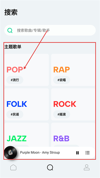3、在搜索页的主题歌单区,选【POP-流行】分类,能进入对应的歌单集合页,发现更多流行风格歌曲呢。