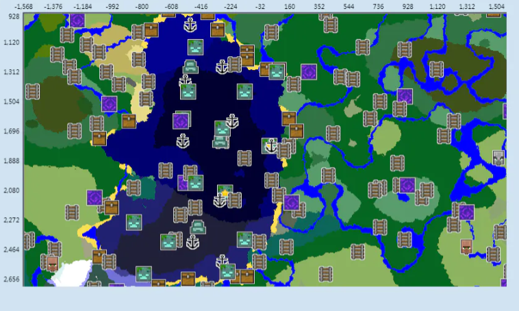 2.第二个地图是位于初生点东北向,十个沉船,还有四个海洋神殿[地图中被挡住了],前期快速获得资源,末地要塞就在海洋的正东方边界处