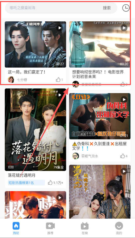 2、想找热门内容,直接进入“推荐”页,这里有大电影“哪吒之魔童闹海”和排名第一的短剧“落花错付明月”。