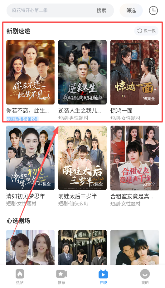 4、在“短剧”专区,可以通过“热播榜”和“换一换”功能发现新剧,每部剧都标明了集数和题材,方便你快速挑选。
