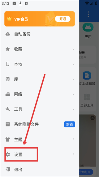 1、在文件管理类APP的侧边栏,点击【设置】,可进入设置界面,准备调整搜索引擎相关配置啦。