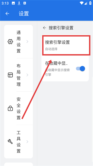 3、在搜索引擎设置界面,点击顶部的【搜索引擎设置】选项,可展开搜索引擎的选择列表啦。