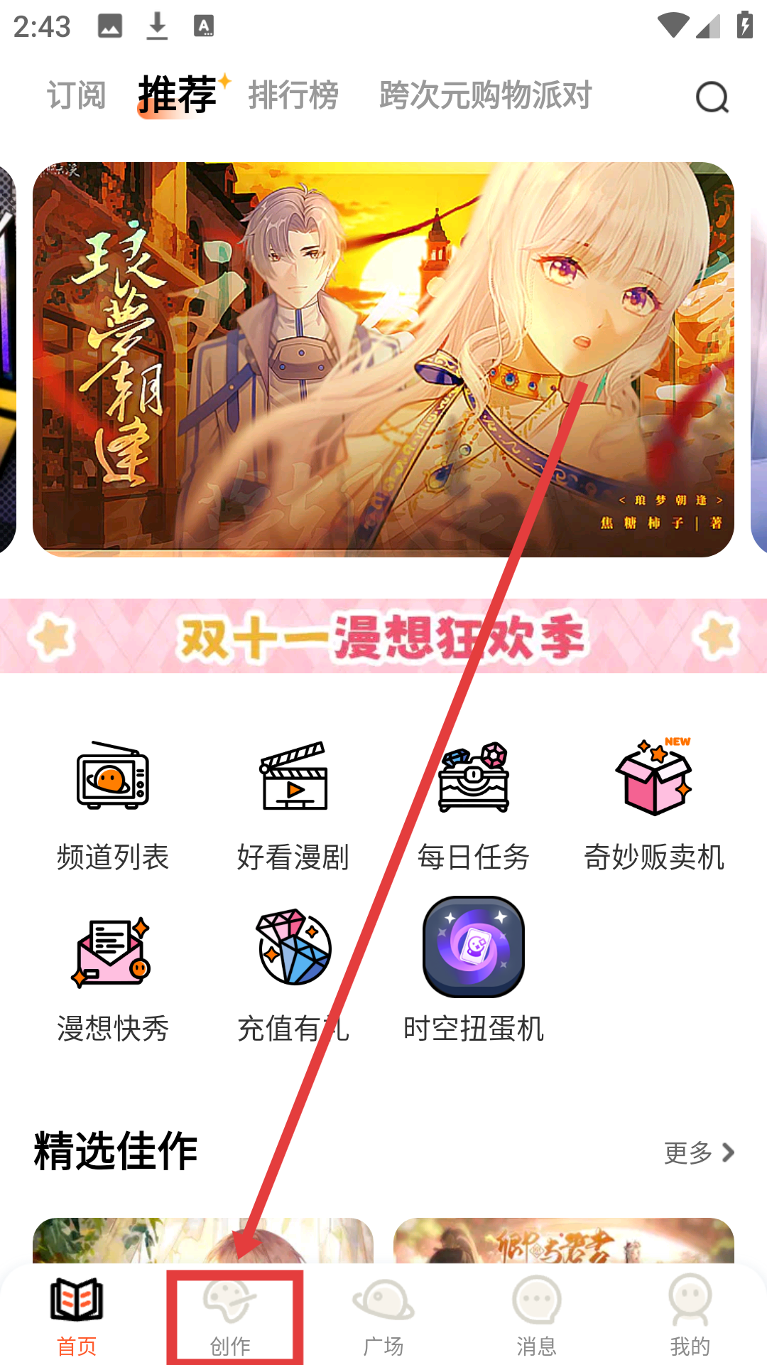 1、点击【创作】,进入创作空间界面,可开启创作之旅哦。