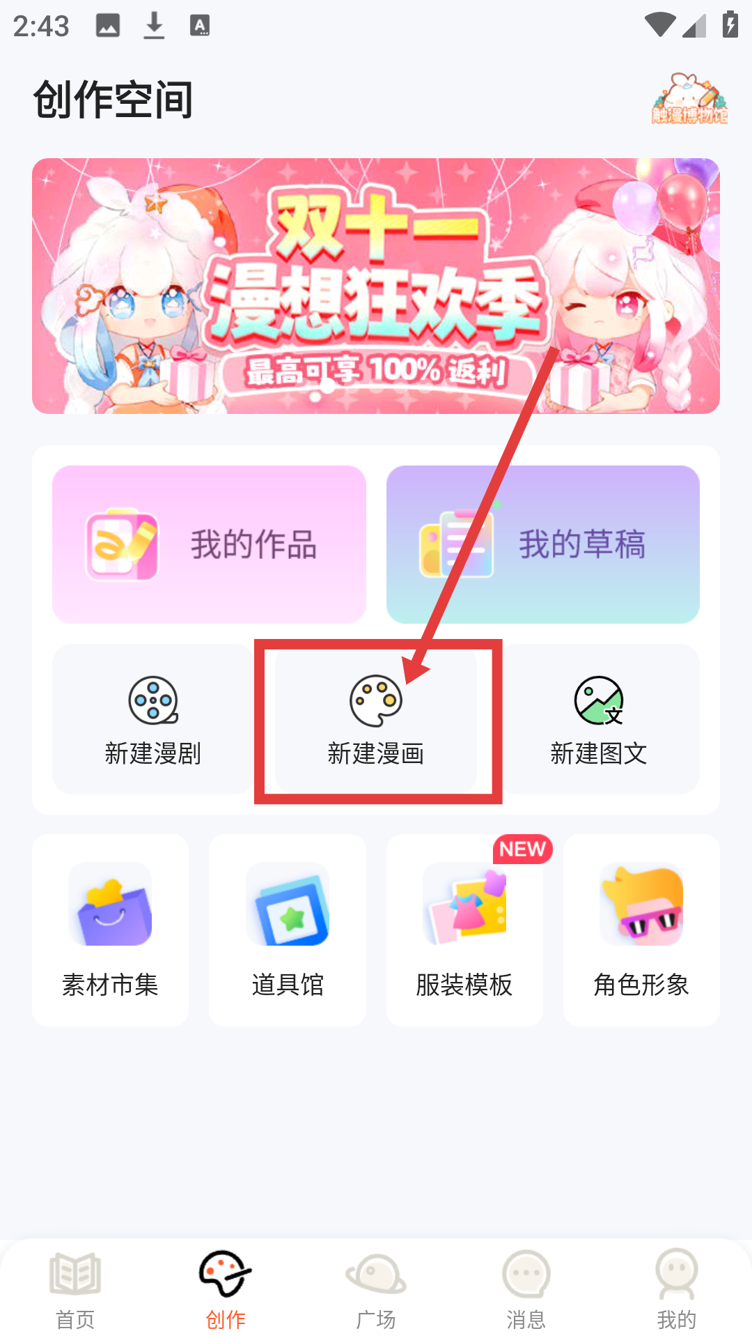 2、在创作空间界面点击【新建漫画】,可进入漫画创作准备界面啦。