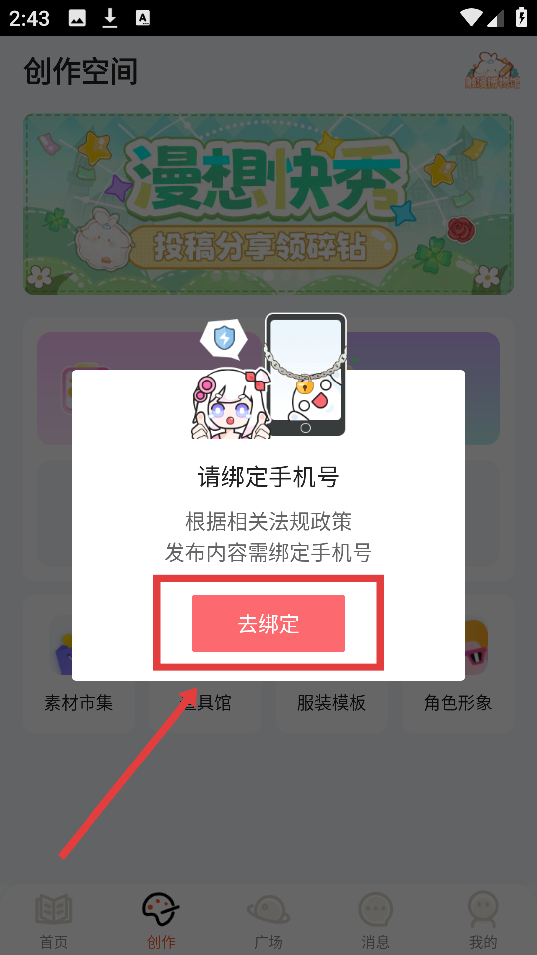 3、若需绑定手机号,点击【去绑定】完成手机号绑定,即可继续创作哦。