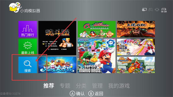 2、打开小鸡模拟器,进入主界面,在画面下方共分有6个项目,分别是【推荐】、【专题】、【分类】、【对战】、【管理】、【我的游戏】,可以通过电视的遥控器与小鸡手柄实现页面之间的切换。