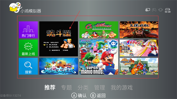 1、在小鸡模拟器首页,能看到【热门排行】等分类,选【魂斗罗】可进入游戏详情页体验经典游戏哦。