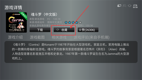 2、进入魂斗罗详情页后,点【收藏】按钮能把游戏加入收藏列表,方便后续快速找到它啦。
