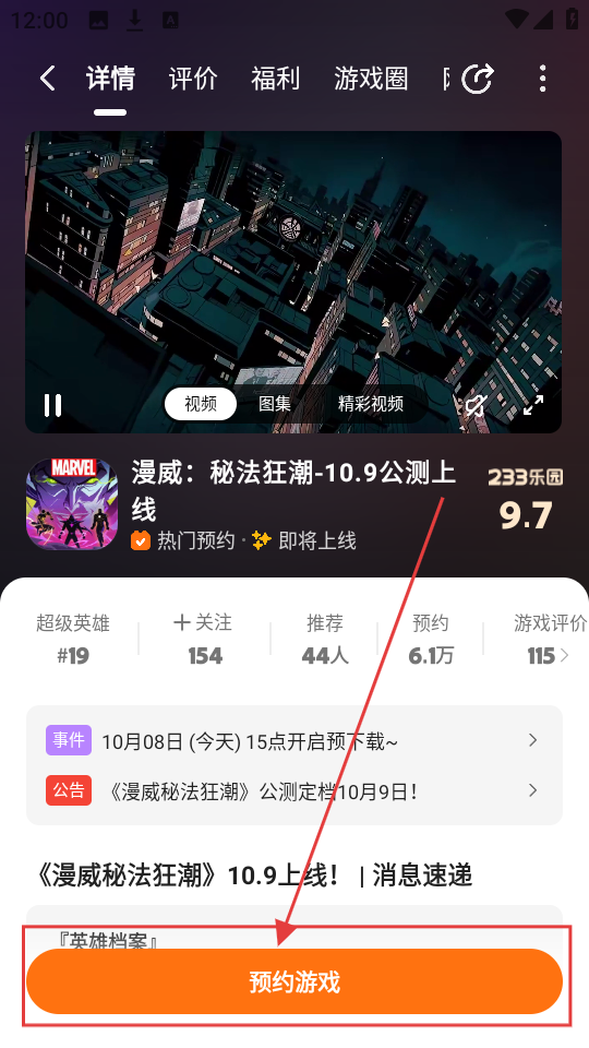 2、进入【漫威秘法狂潮】游戏详情页后,我们点击【预约游戏】按钮,就可以预约这款游戏啦。