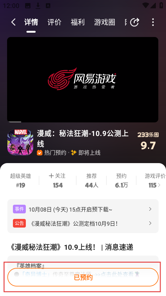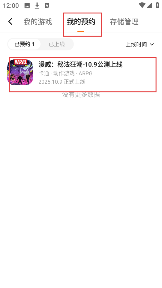 4、我们还能进入【我的预约】页面,在这里可以看到自己预约的【漫威:秘法狂潮-10.9公测上线】游戏,方便查看预约情况哦。