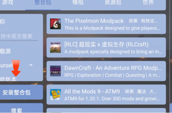 注意,整合包文件名为“modpack”4、最后点击安装,就能够成功安装整合包了
