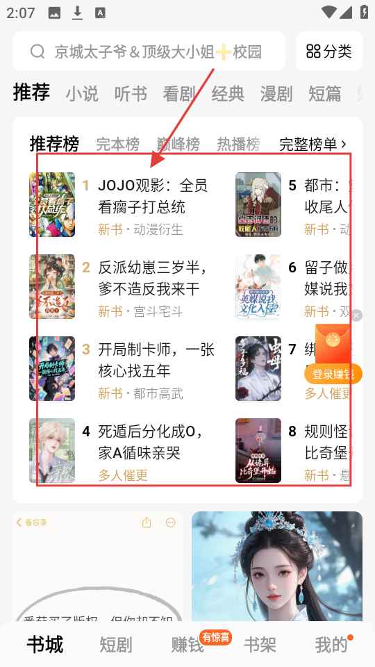 1、在书城推荐榜里,能看到各类小说,找到感兴趣的,像【JOJO观影:全员看瘸子打总统】,点击它就能进入阅读页面啦。