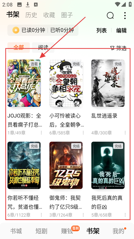 4、去书架页面,能看到之前加入的小说,比如【JOJO观影:全员看瘸子打总统】就在那里,直接点击就能继续阅读啦。