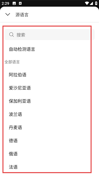 2、在源语言列表里可通过搜索或直接选目标语言,选好后就能确定翻译的源语言类型哦。