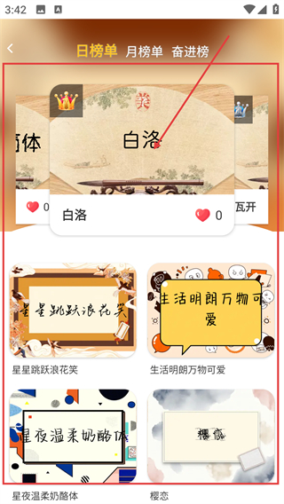 2、进入字体榜单页后,可浏览日榜单、月榜单里的字体,挑选喜欢的字体进入详情页哦。