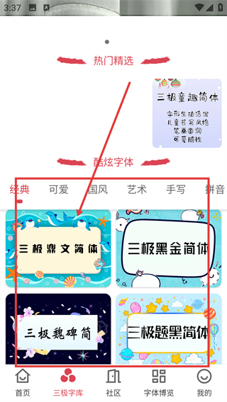 2、进入三极字库页面后,可通过分类标签(如经典、可爱)筛选字体,选择心仪的字体样式查看详情哦。