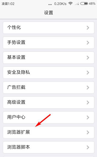 2、点击右下角设置,在设置页面, 点击“浏览器扩展”