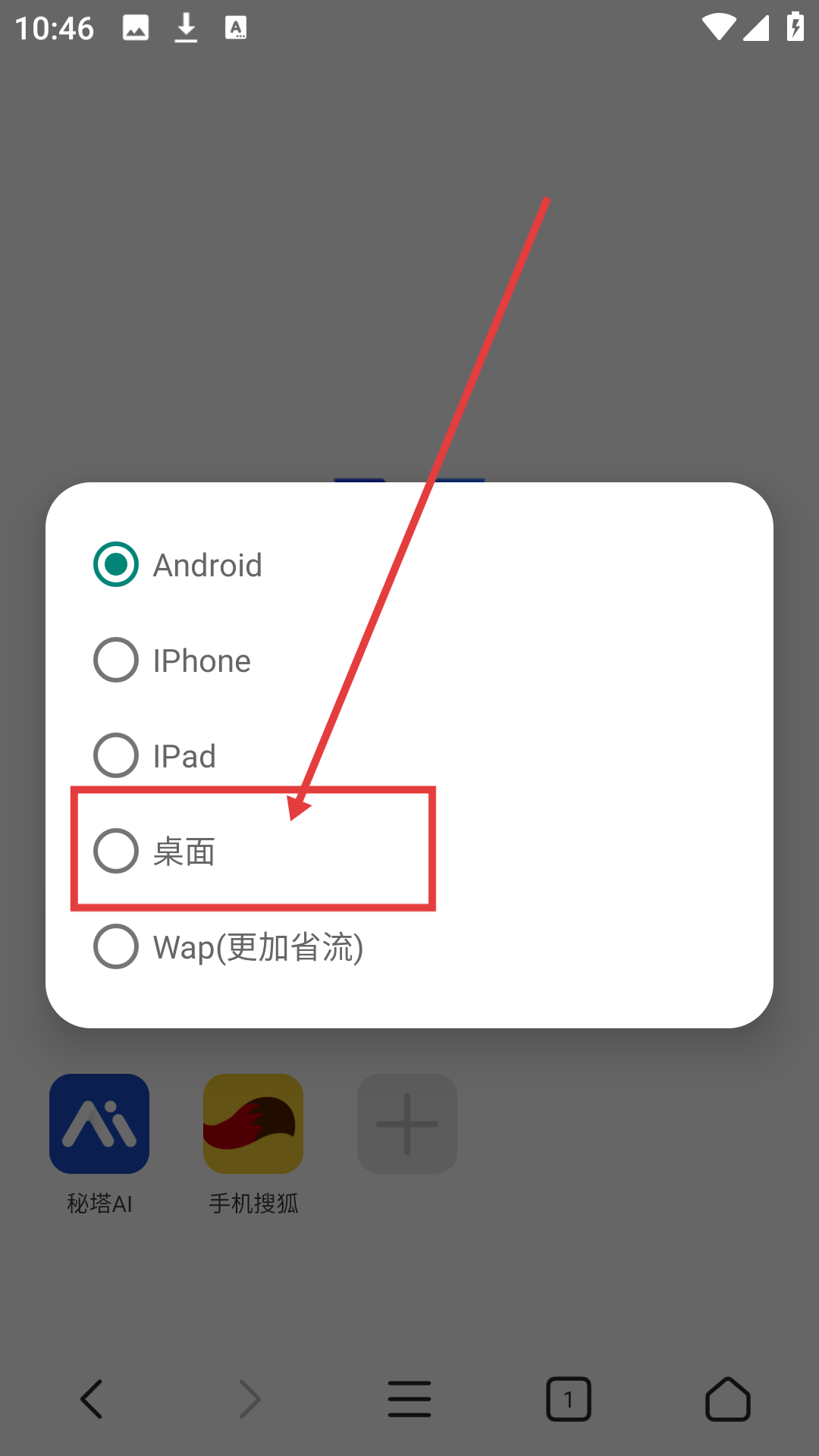 4、在UA选择界面,选择【桌面】选项,即可将浏览器UA切换为桌面模式,享受桌面端浏览体验哦。