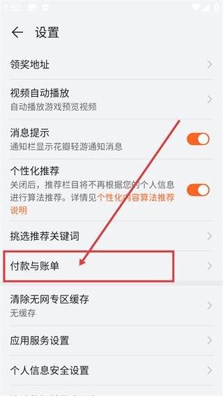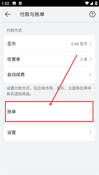 2、进入设置页后,点击【付款与账单】选项,就能进入支付相关的管理页面,查看付款信息哦。