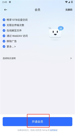 4、同时我们还可以使用兑换码来兑换会员,点击左上角的【兑换码】后输入上兑换码点击【立即兑换】即可;