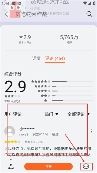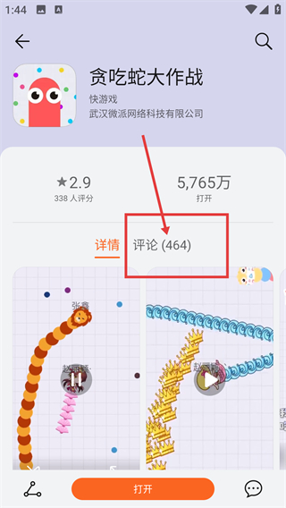 2、进入【贪吃蛇大作战】详情页后,点【评论】选项,就能查看其他用户对这款游戏的评价哦。