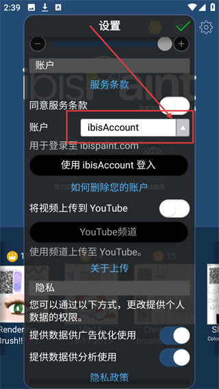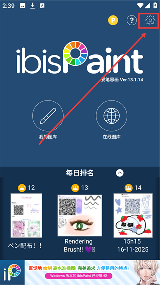 1、在ibisPaint首页,点右上角设置图标能进入设置页面,可配置账号及功能相关的参数啦。