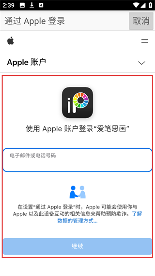 4、进入Apple登录页后,输入对应账号信息,点【继续】按钮,就能完成通过Apple登录ibisPaint的操作啦。