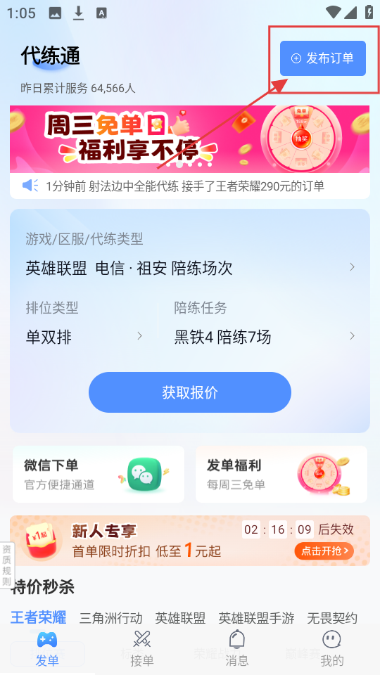 1、在代练通发单页面,点击【发布订单】,可进入订单发布流程,准备发布代练或陪练订单啦。