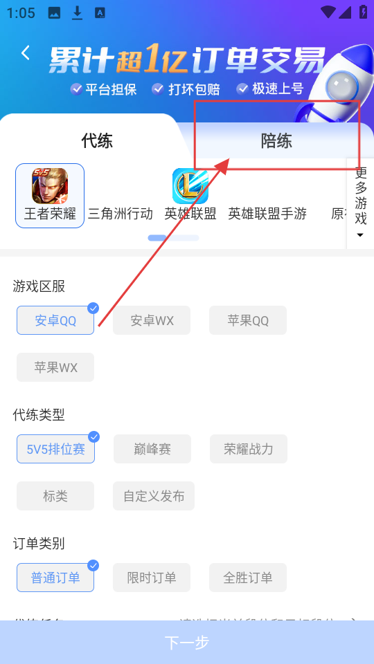 2、进入订单发布流程后,点击【陪练】,可选择陪练业务,继续发布陪练订单哦。