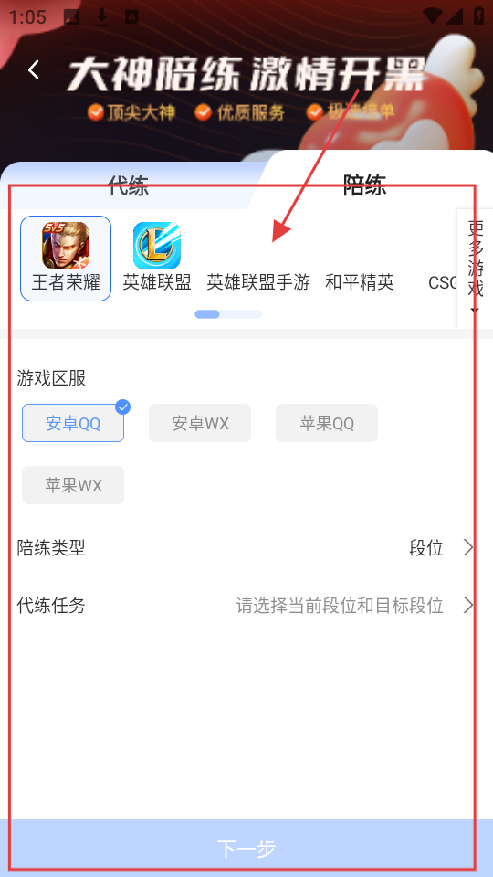3、在陪练订单发布页面,选择游戏、区服、陪练类型等信息,完成订单信息填写啦。