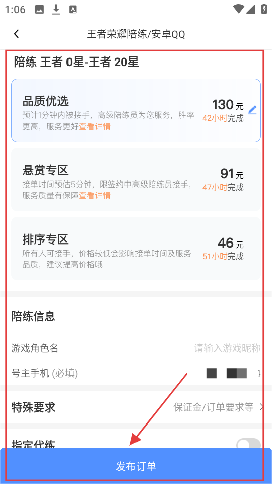 4、填写好订单信息后,点击【发布订单】,可将陪练订单发布出去,等待接单啦。