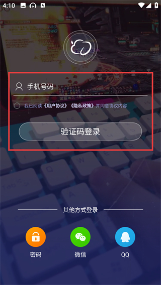 1、登录界面红框含【手机号码】输入框、【用户协议】勾选框和【验证码登录】按钮。