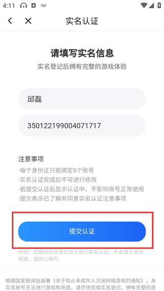 4、【实名认证】填写页红框点击【提交认证】按钮,需确认注意事项后提交。