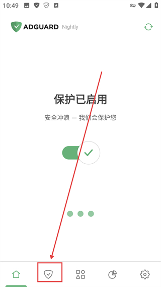 1、在【ADGUARD】主界面点击底部的盾牌图标,就能进入功能管理页面,查看各类安全防护选项啦。