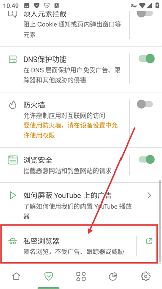 2、进入功能管理页后点击【私密浏览器】选项,就能进入私密浏览的设置页面,配置匿名浏览相关功能哦。
