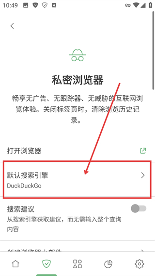 3、在私密浏览器页面点击【默认搜索引擎】选项,就能打开搜索引擎选择面板,更换默认的搜索工具啦。
