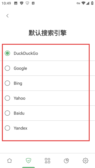 4、在默认搜索引擎面板中可选择【DuckDuckGo】【Google】等选项,选好后私密浏览会使用该引擎搜索哦。