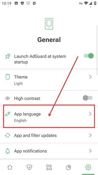 1、在【ADGUARD】主页面点击底部的设置图标,就能进入设置界面,调整应用的各类配置啦。