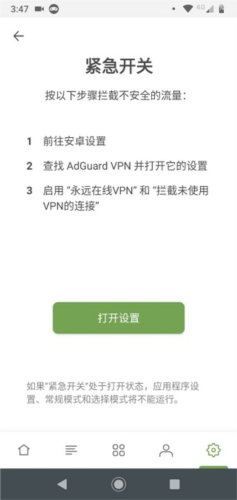 1、在一些情况下,我们绝不可公开我们的数据或网络活动,比如,连接公共 WiFi 时。Kill Switch 保证当 隧道断开时,彻底关闭你的连接。这是非常实用的功能!为了开启 Kill Switch,请你前往 设置 → Kill Switch(紧急开关) → 打开设置 → Adguard ,并勾选 “永远在线” 和 “拦截未使用 的连接”。