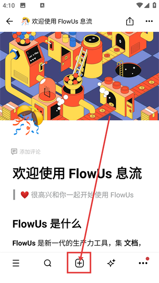 1、在FlowUs欢迎页点底部的【+】按钮,能进入新建页面界面,后续可选择模板创建内容啦。